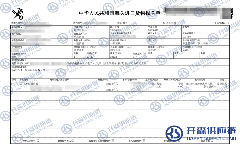 【本文結語】 上述就是澳大利亞蛋黃石寶石進口報關代理服務【清關案例】的全部內容,希望能對您有所幫助,如有寶石進口報關上任何疑問及問題可隨時在線聯系我們或撥打 18002611553,開森供應鏈擁有豐富的寶石進口報關操作經驗及案例,10余年進口經驗為您所用,各類進口疑難都能為您一一解答及協助快速處理解決!