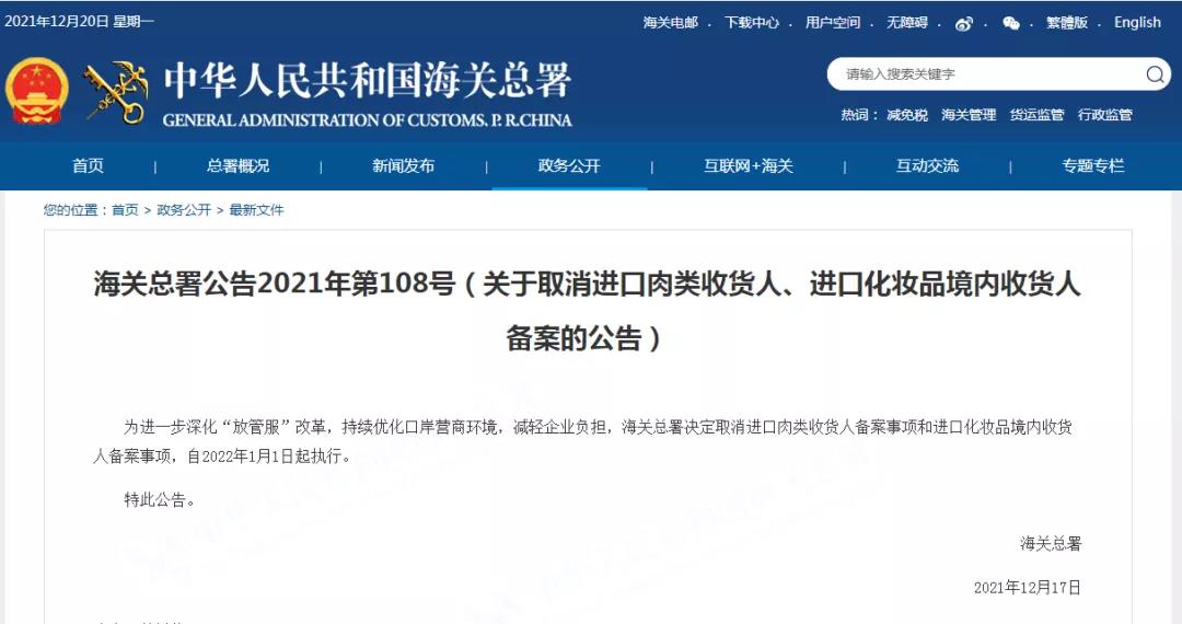 2021年12月17日,海關總署發(fā)布2021年第108號公告:為進一步深化“放管服”改革,持續(xù)優(yōu)化口岸營商環(huán)境,減輕企業(yè)負擔,海關總署決定取消進口肉類收貨人備案事項和進口化妝品境內(nèi)收貨人備案事項,自2022年1月1日起執(zhí)行。