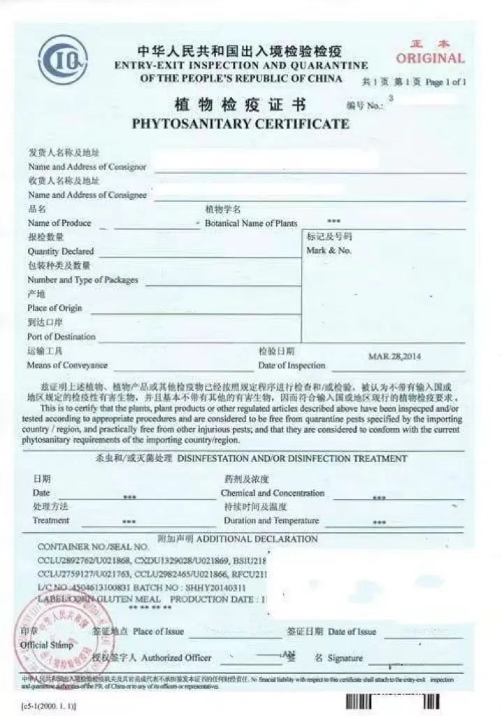 【該批貨物來自注冊加工企業(yè)(注冊號***),符合盧旺達甜葉菊輸華植物檢疫要求議定書要求”】。經(jīng)熏蒸處理的,還應在植物檢疫證書中注明熏蒸處理日期、溫度、濃度和持續(xù)時間等處理指標。