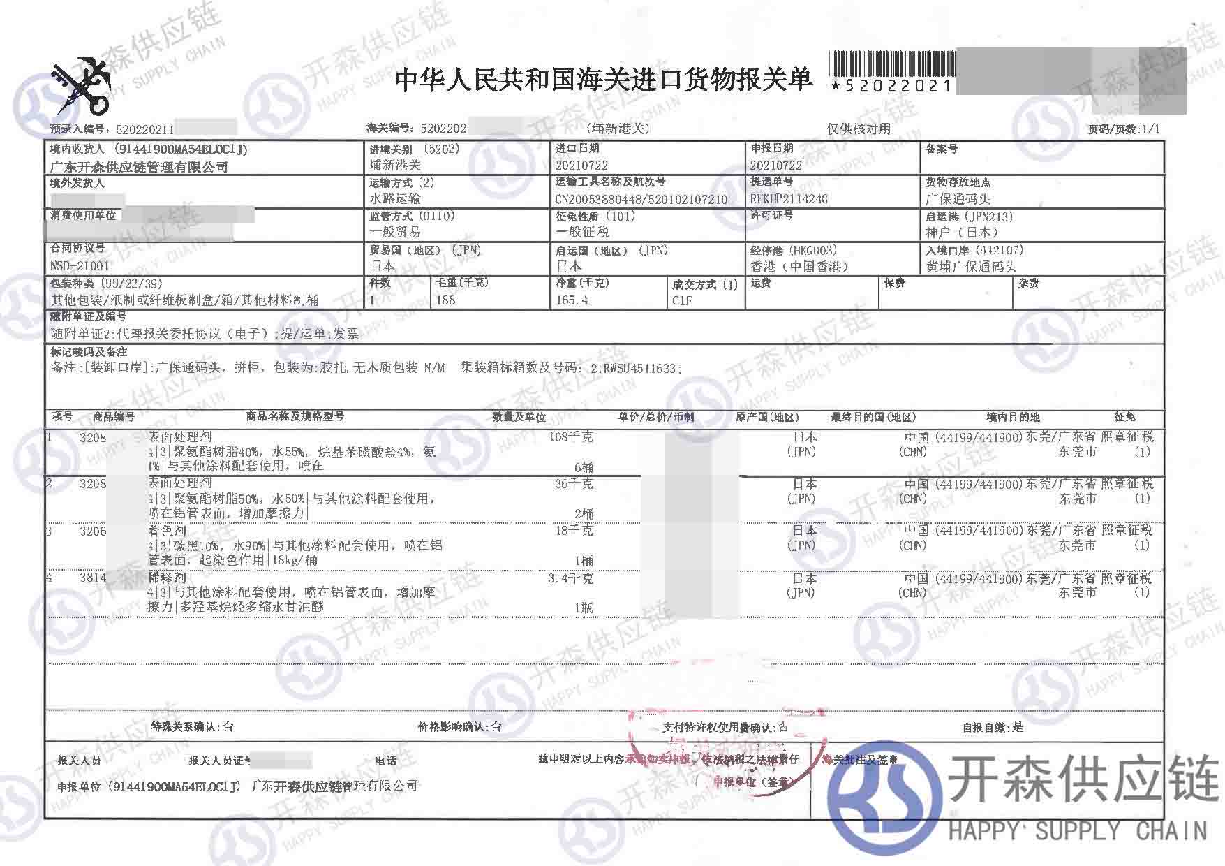 開森進口供應鏈擁有豐富化工品進口清關操作經驗及案例,憑借“專業、高效、便捷、實惠”的報關服務,以及多年來積累的雜貨進口報關案例與經驗,能為客戶量身定做出專業、高效的化工品進口報關方案。