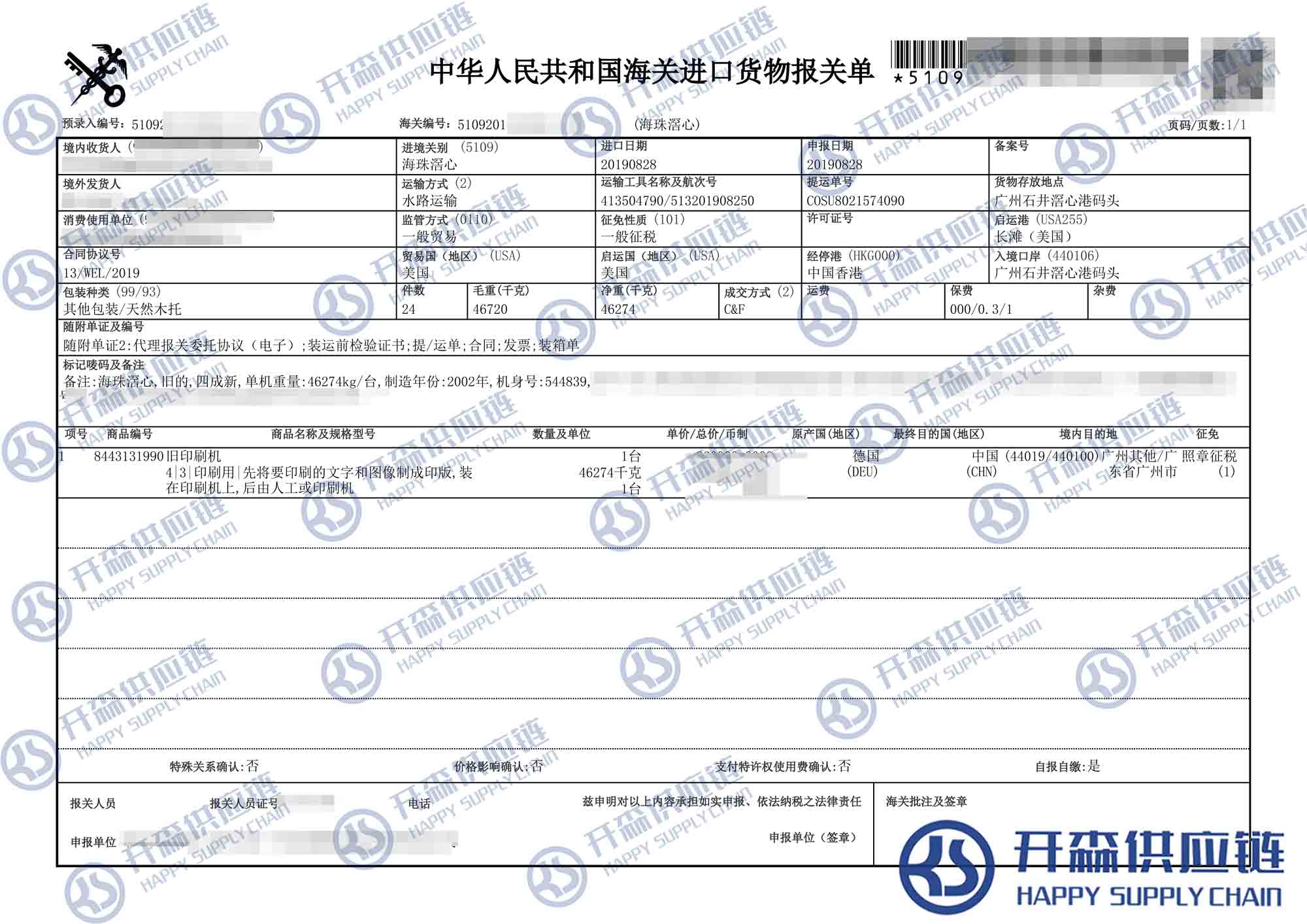 【本文結(jié)語】 上述就是【進(jìn)口案例】廣州港二手印刷機(jī)進(jìn)口報關(guān)代理服務(wù)的全部內(nèi)容,希望能對您有所幫助,如有二手印刷機(jī)進(jìn)口報關(guān)上任何疑問及問題可隨時在線聯(lián)系我們或撥打 18002611553,開森供應(yīng)鏈擁有豐富的二手印刷機(jī)進(jìn)口報關(guān)操作經(jīng)驗及案例,10余年進(jìn)口經(jīng)驗為您所用,各類進(jìn)口疑難都能為您一一解答及協(xié)助快速處理解決!