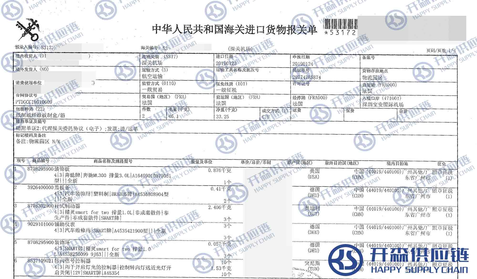 開森供應鏈擁有多種多樣的汽車配件進口渠道與豐富的進口報關案例。我司提供收貨、報檢(商檢)、報關清關、貨物運輸一條龍服務。我們公司的優(yōu)勢:1、價格優(yōu)惠;2、安全快速;3、專業(yè)與便捷。
